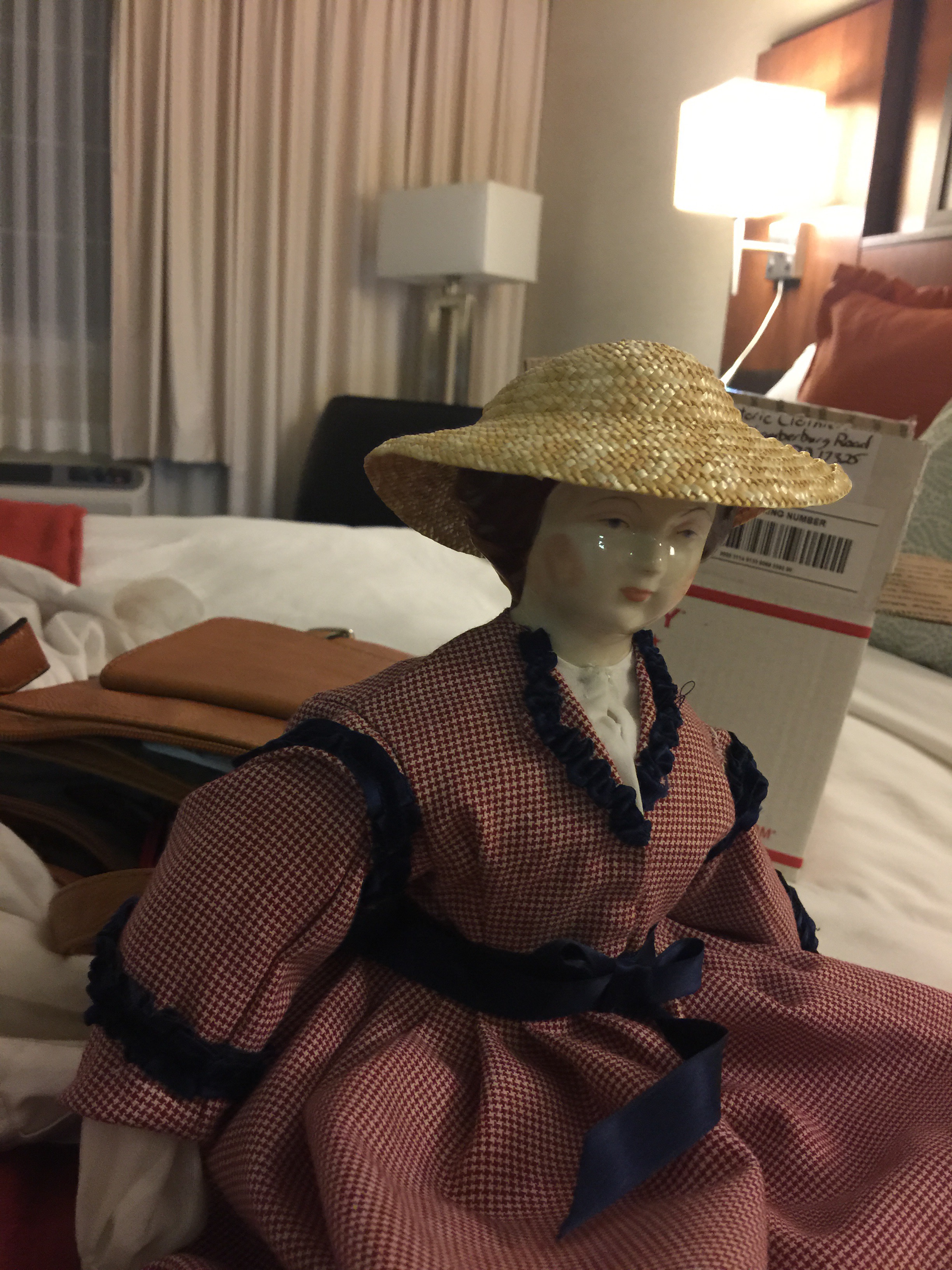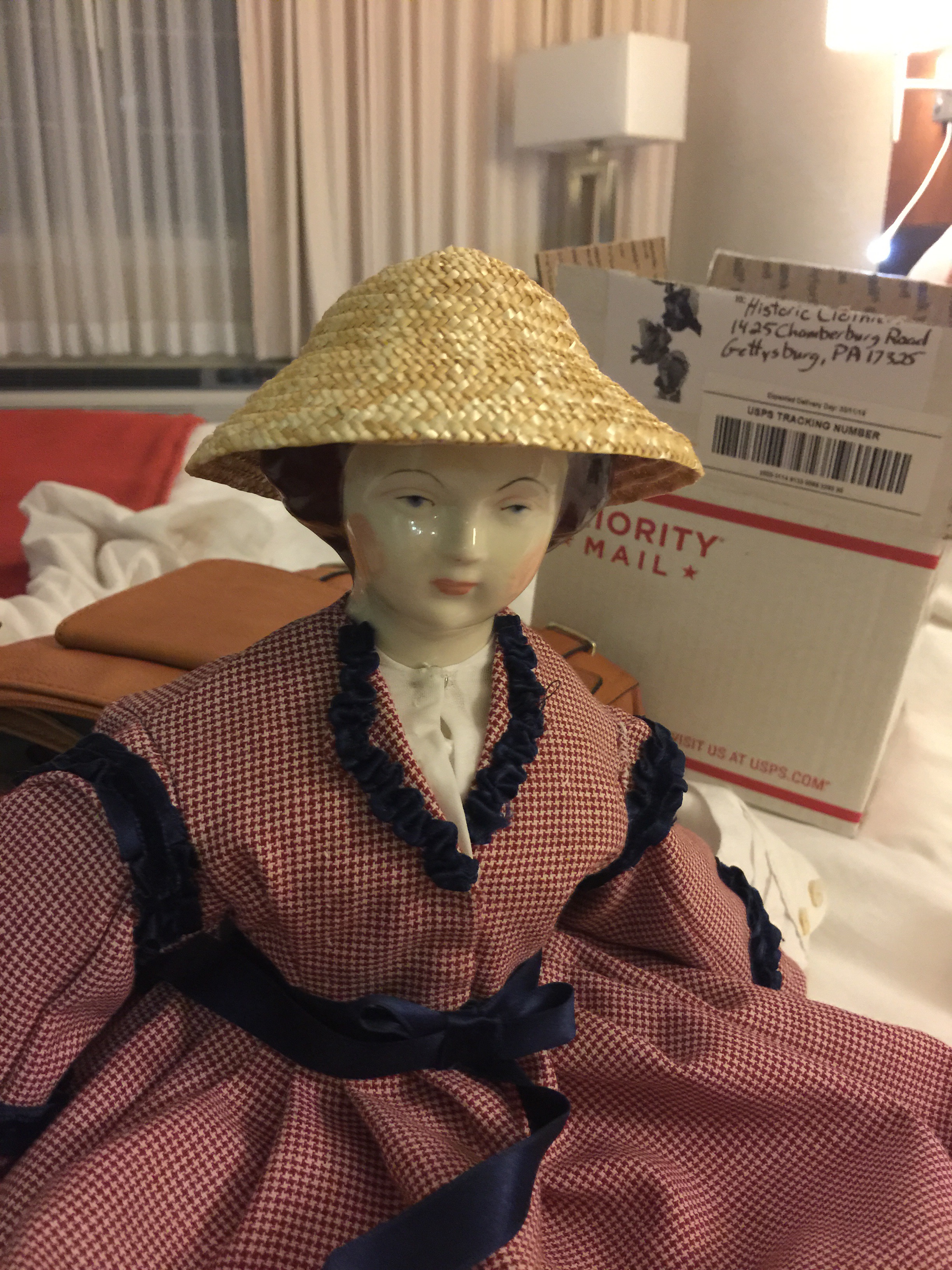 For the start of the second day I got to sleep in since Samantha had to set up the sutlery in the vendor hall. I even had breakfast in bed! Mr Sekela had to go back to Gettysburg for a few items and when he did he brought me a package. It was from Anna Bauersmith! I love when packages from her arrive. Here are the two peices of millinery that arrived. One is s croquet ensemble hat and another a fashion sun hat.