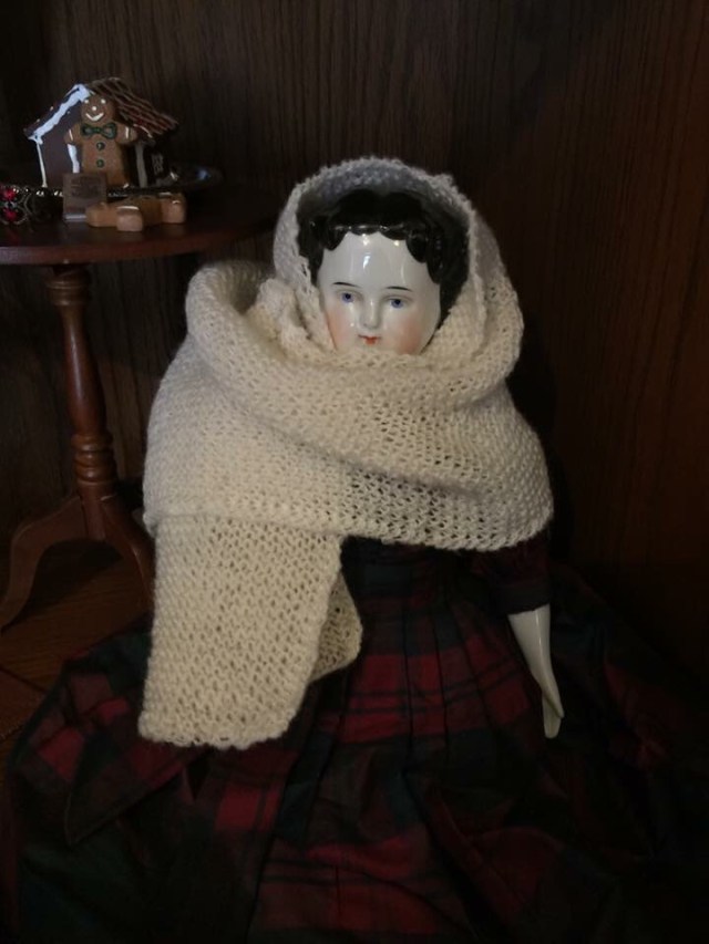 The piece I am working on is called a “Nubia”. Here is the pattern for the full size Nubia. Basically its a long wide scarf you wrap around your head gracefully for nicer occasions. The pattern for the full sized version is three yards long. Obviously a doll version wont be as long. I made the first version I made 15 inches long by 5 inches wide. I have knitted a full size version and never want to do it again. It took FOREVER! The doll version isn’t quite as bad but still just as mindless. The size of it is perfect for a work project.