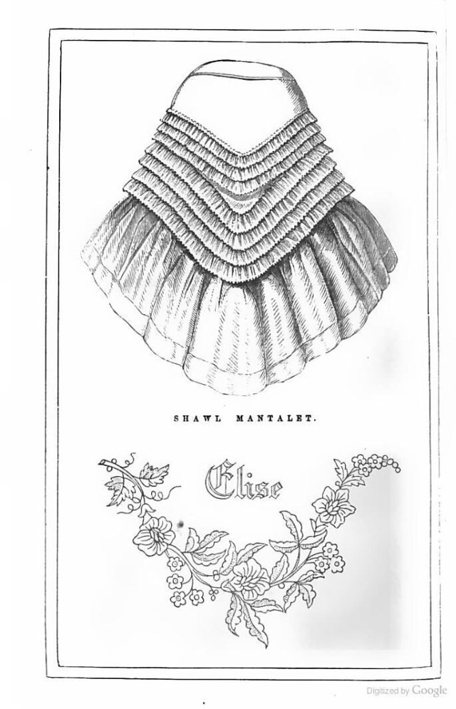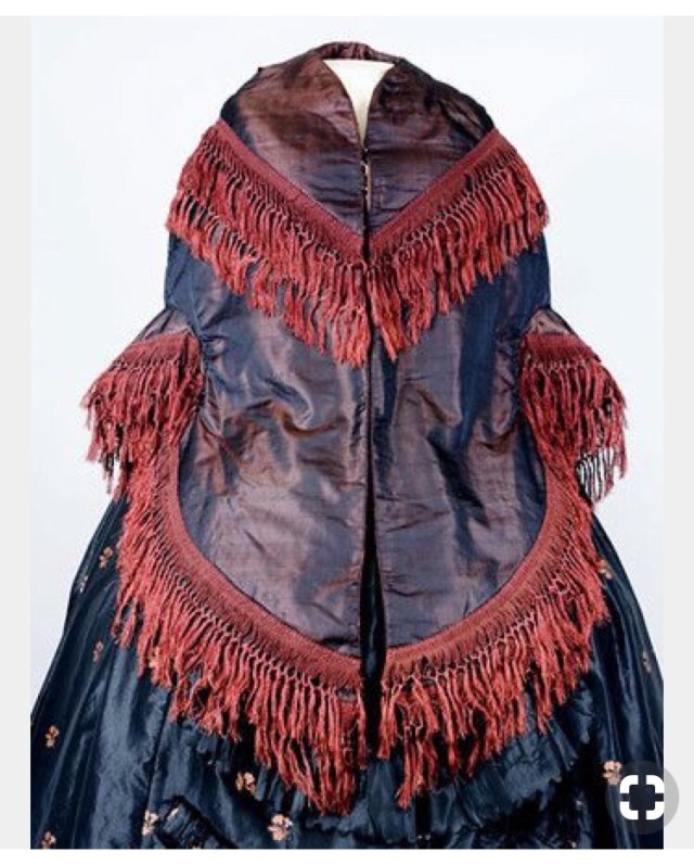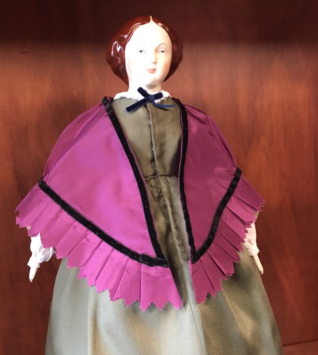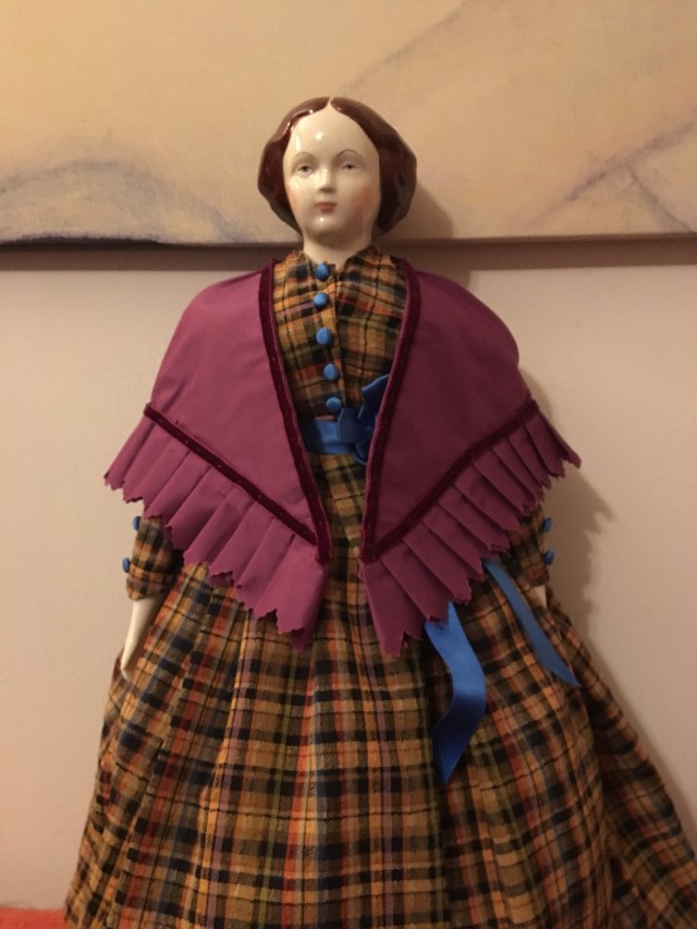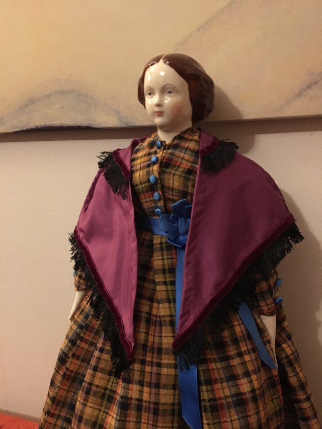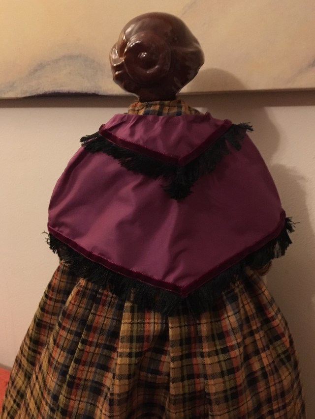 What do you do when you have a half yard of violet silk fabric? I don’t know what you would do but my answer was to make an 1860’s mantle for a doll!