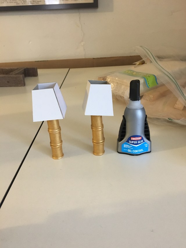 Up first is a set of lamps made from ½” wooden craft store bobbins (the kind you get in the woodworking section). I had a total of 6 left from another project. So I glued three stacked one on top of another and then painted them gold. I used gold because I had it in my stash and wanted a bright neutral (I consider gold a neutral).