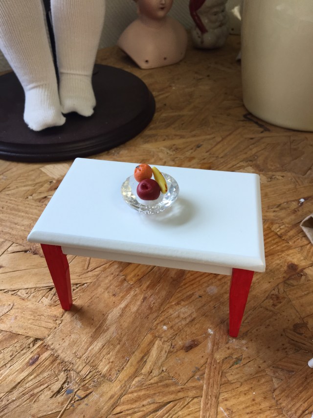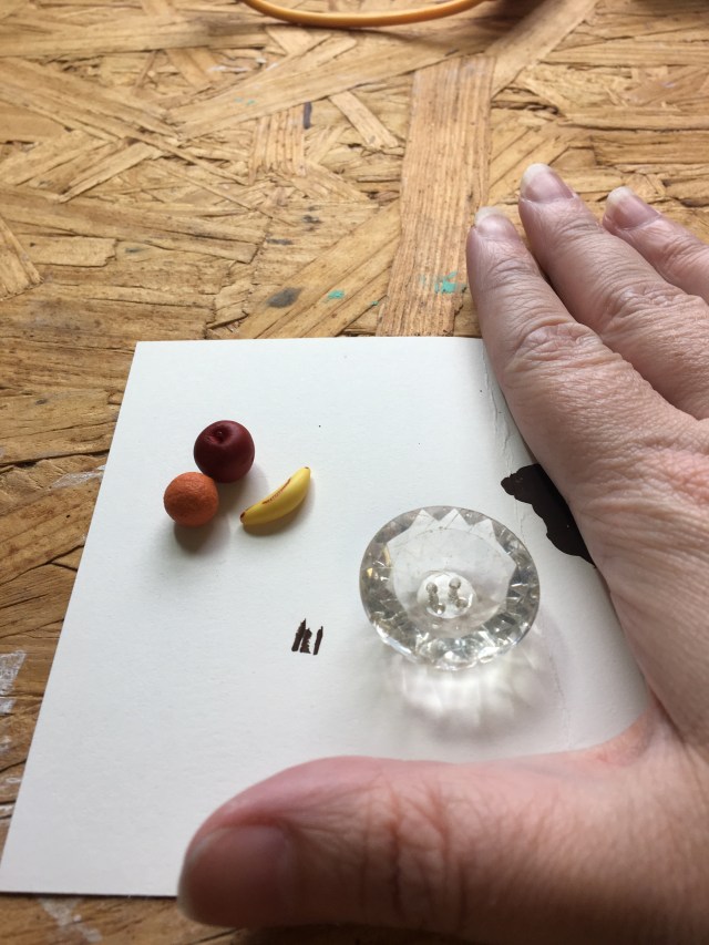 Next small project I did for the house was a bowl of fruit for a table. I was digging through a bag of vintage buttons and came across a button that was clear cut glass and in the shape of a bowl. At the widest point it is about an inch wide. I washed and dried it and then glued in the dollhouse sized fruit using regular tacky glue (which I also had in my stash). Stash busting for the win!