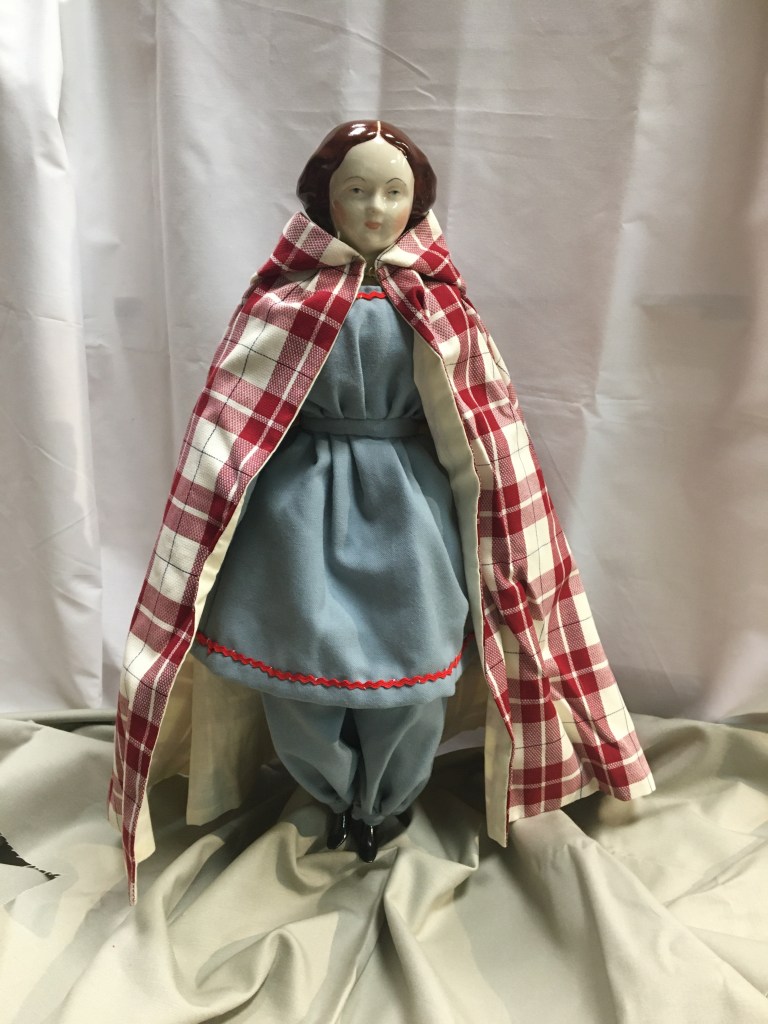Here is the plaid cape with hood. This is made from a cotton pique type fabric. Many times these outfits had multiple layers to protect the wearer from the elements.