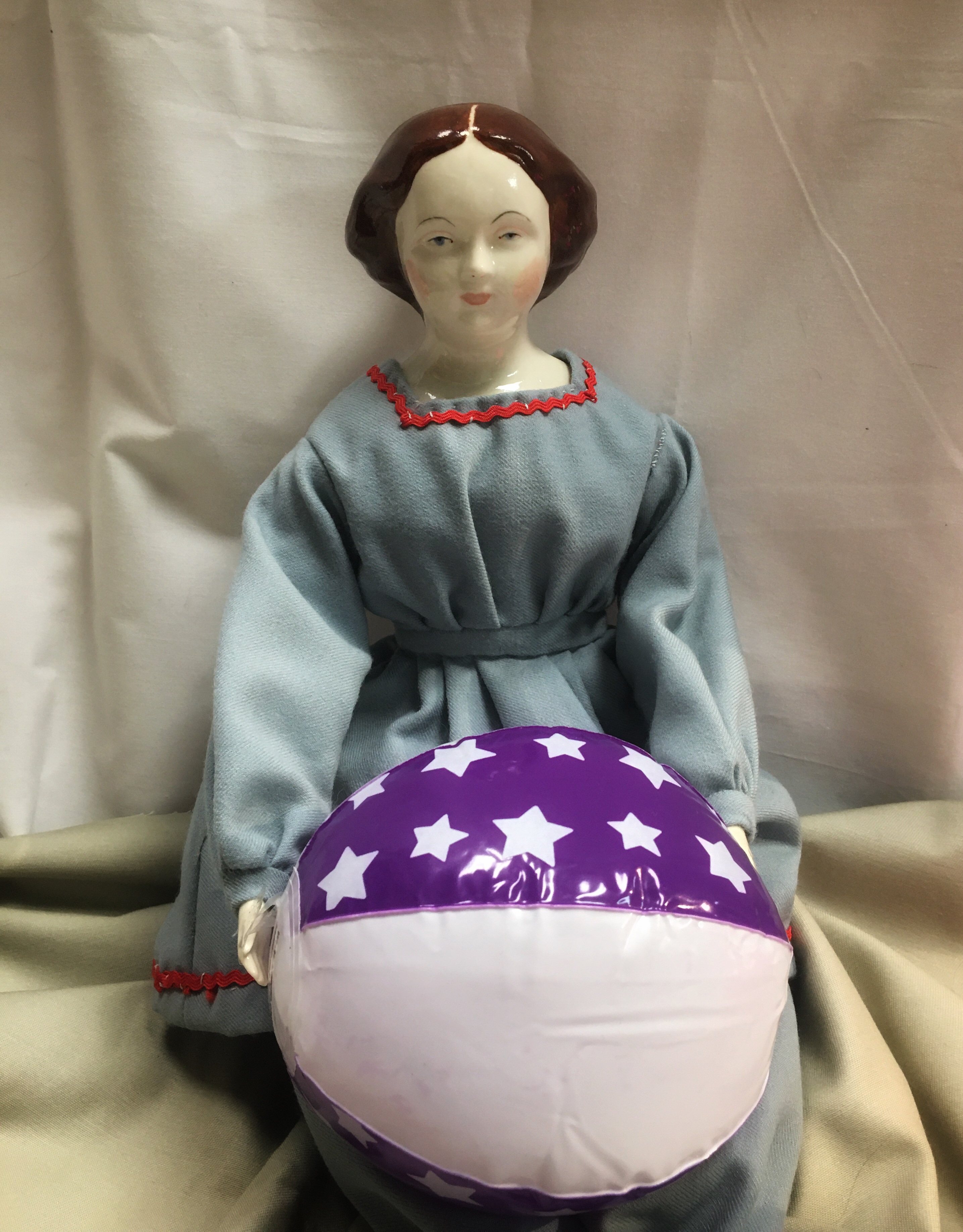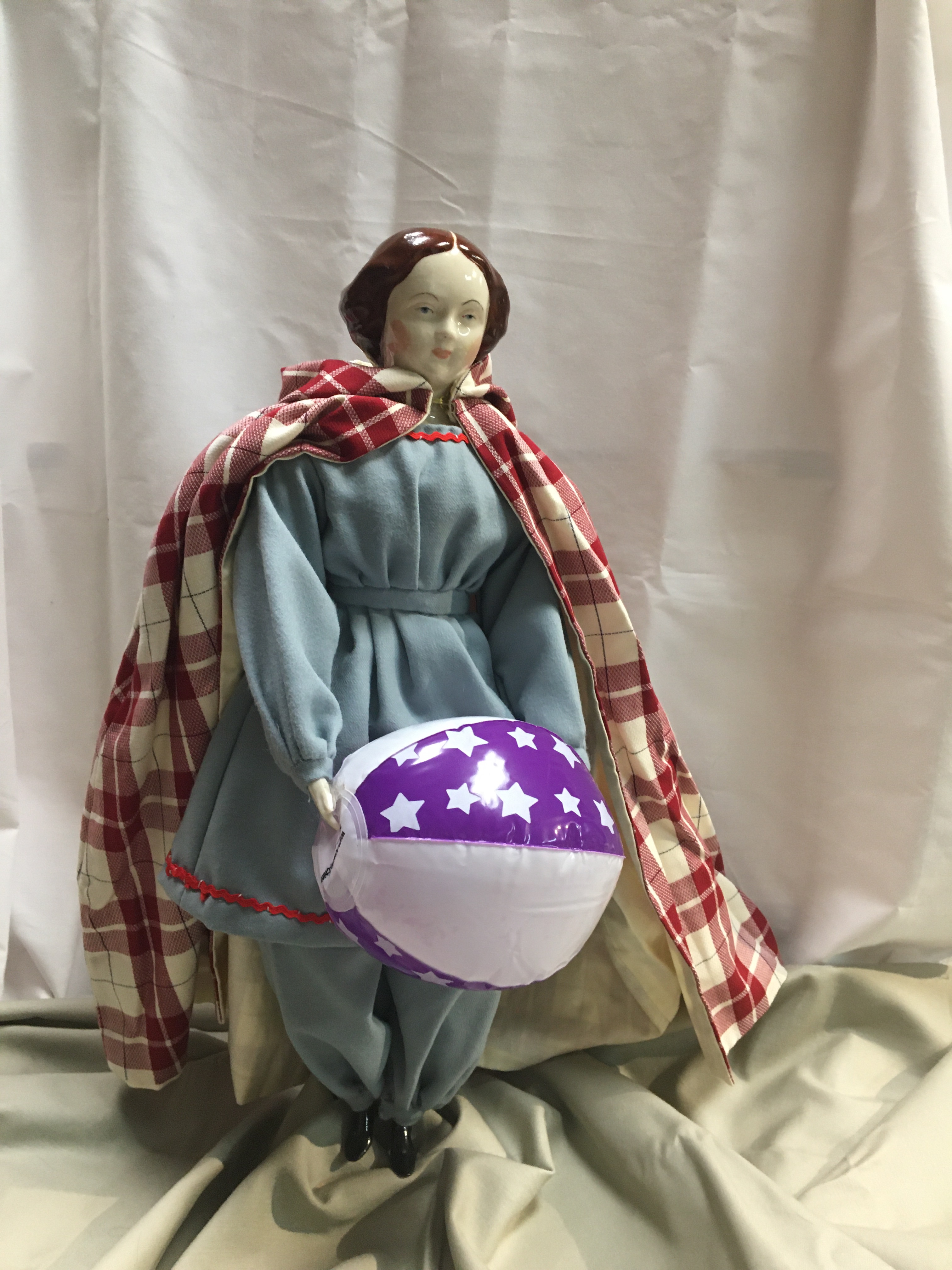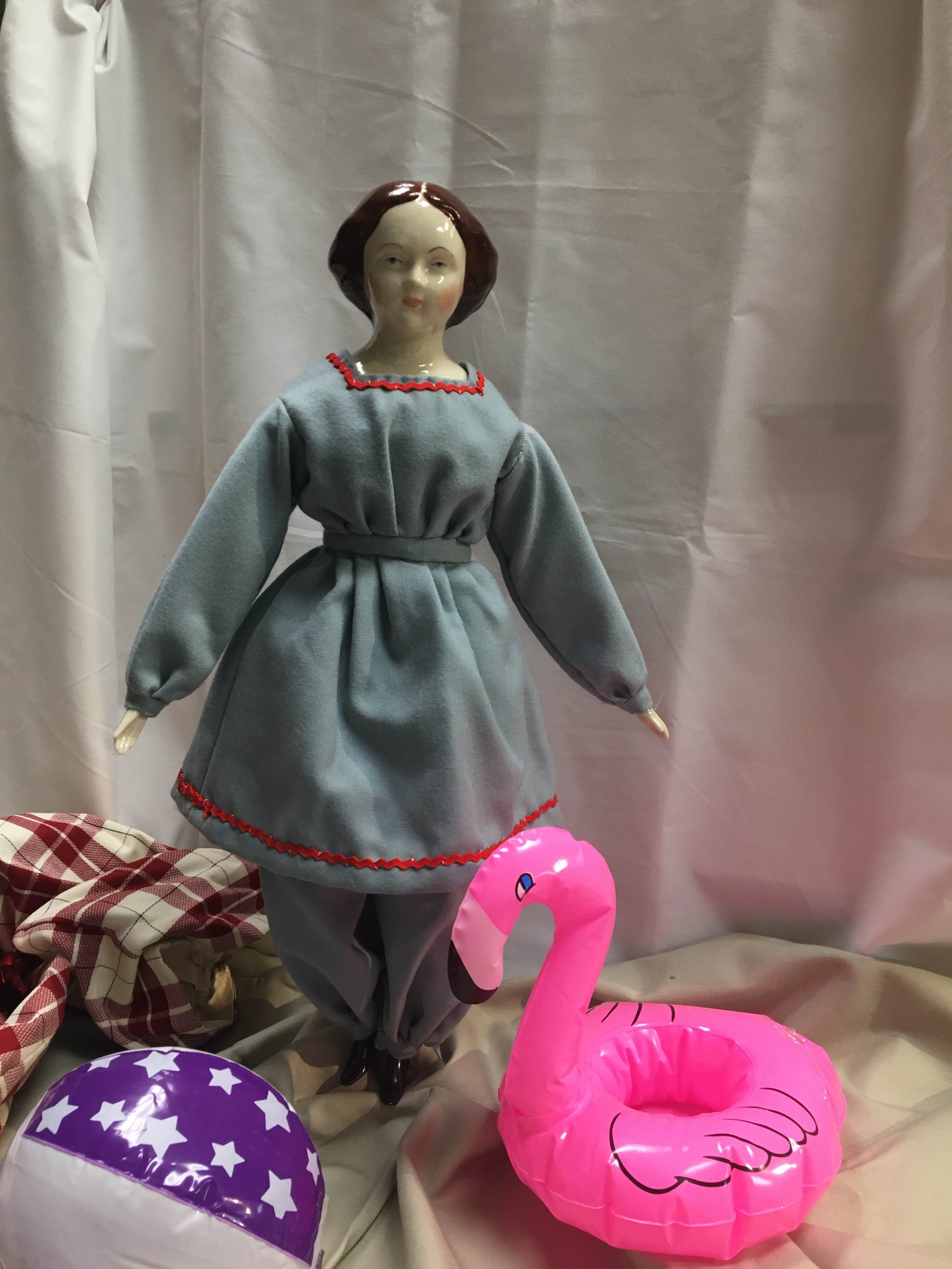 Full view of the two piece wool bathing costume. It is trimmed with Rick rack. This would not have been seen in a full size humans costume but only in doll sized garments.